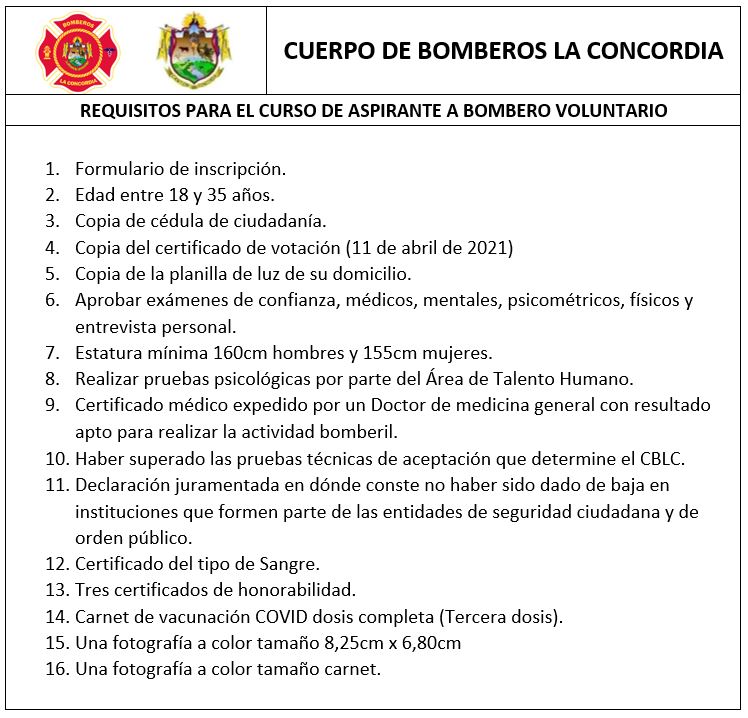 El Cuerpo de Bomberos La Concordia, con el objetivo de integrar nuestras filas; mejorando la capacidad operativa de respuesta a eventos adversos dentro del cantón, convoca a quienes deseen ser parte del curso de aspirante a BOMBERO VOLUNTARIO, donde se generará competencias, capacidades y doctrina del personal postulante, para la prevención y control de eventos adversos de competencia institucional.